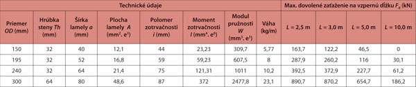 Tab. 1: Rozmery, prierezové charakteristiky a nosnosť štandardne vyrábaných dutých drevených stĺpov