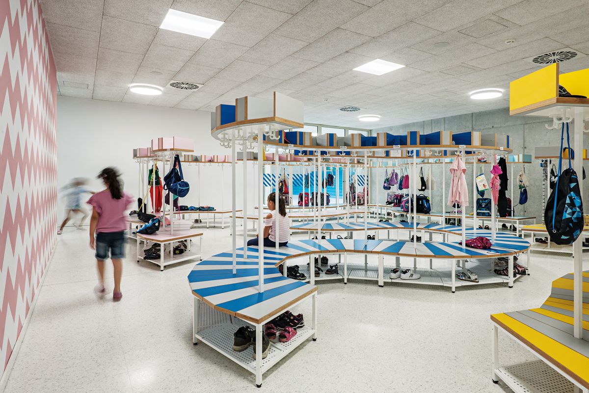 Dostatok denného svetla majú nielen učebne, ale i telocvičňa. Architekti sa opäť rozhodli pre netradičnú farbu perforovaného obkladu.