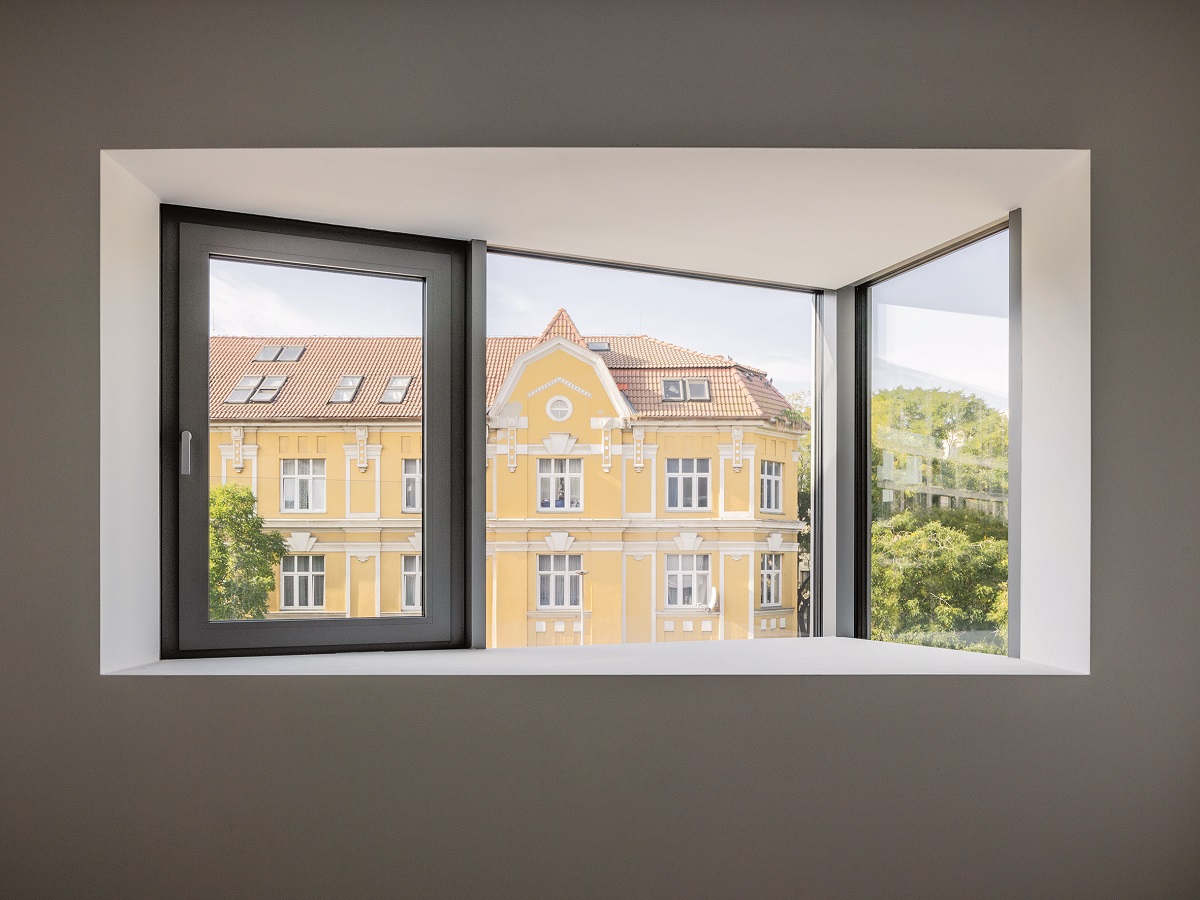 Kvalitné hliníkové okná zabezpečujú, že hluk z ulice neprenikne do bytových priestorov. Ich atypické prevedenie vytvorilo originálnu fasádu. Okná zároveň vytvárajú v interiéri akýsi tretí priestor, príjemné miesto napríklad na sedenie a tiché pozorovanie ruchu ulice.