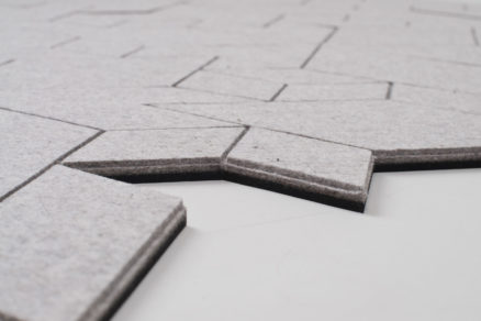 Cityscapes je modulárny dlaždicový koberec. Nevyužíva však dvoj-, ale trojosovú symetriu, čo v praxi vytvára escherovský izometrický vzor, podobný štylizovanej mestskej výstavbe. | Zdroj: Archív štúdia ALLT