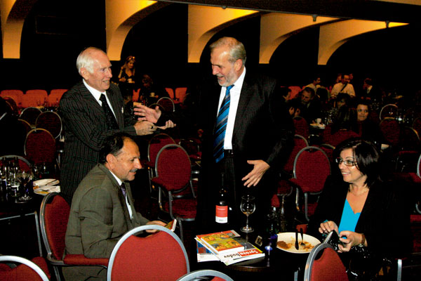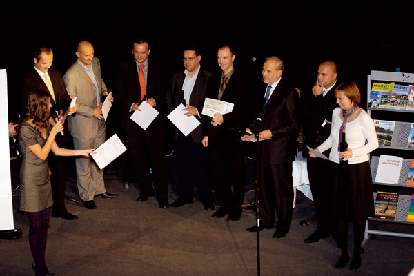 | Galéria ocenených partnerov vydavateľstva JAGA GROUP – zľava moderátorka večera Hana Rapantová, Peter Jedinák (Barvy Tebas), Marián Mosorjak (PAM-ak), Vladimír Boroš (Knauf Insulation), Karol Palacka (Rigips Slovakia), Dušan Matejov (Hueck Systém), František Kmiť (Xella), Peter Halász (JAGA GROUP) a Andrea Krajňáková (Holcim Slovensko). | Známy český herec Jaroslav Dušek pripravil predstavenie Čtyři dohody, pri ktorom sa dalo zabaviť aj zamyslieť |