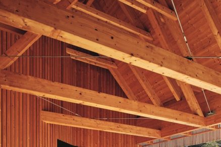 Táto otvorená stolárska konštrukcia sa sama osobe stáva esteticky dôležitou súčasťou celej usadlosti. Je dimenzovaná tak, aby na väzné trámy bolo v budúcnosti možné previesť dostavbu ďalšej pobytovej časti domu. Medzi parkovacími státiami stojí jednoduchý objekt, opláštený polopriehľadným ťahokovom.