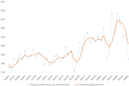 Priemerná úroková sadzba čisto nových úverov na nehnuteľnosti dosiahla v júli 2,5 % a v septembri už 2,9 %. Tomu zodpovedá aj viditeľný pokles čistého prírastku úverov na nehnuteľnosti v priebehu letných mesiacov a septembra. Trhy očakávajú ďalší rast úrokových sadzieb, spomalenie úverovania bude teda pravdepodobne pokračovať. Z toho vyplýva aj pokračujúci pokles aktivity na realitnom trhu.