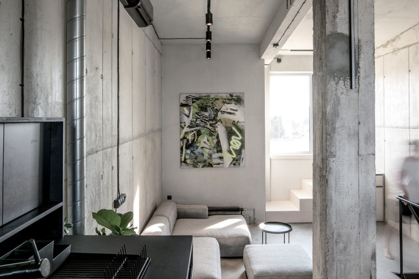 „Stavebné materiály so surovým výrazom, ktoré sme v lofte použili, kontrastujú s vloženými stolárskymi a zámočníckymi prvkami i priznanými rozvodmi na povrchu stien. Obálku loftu tak tvorí neomietnutý liaty betón, železobetónový strop a betónová podlaha s epoxidovým lakom.“