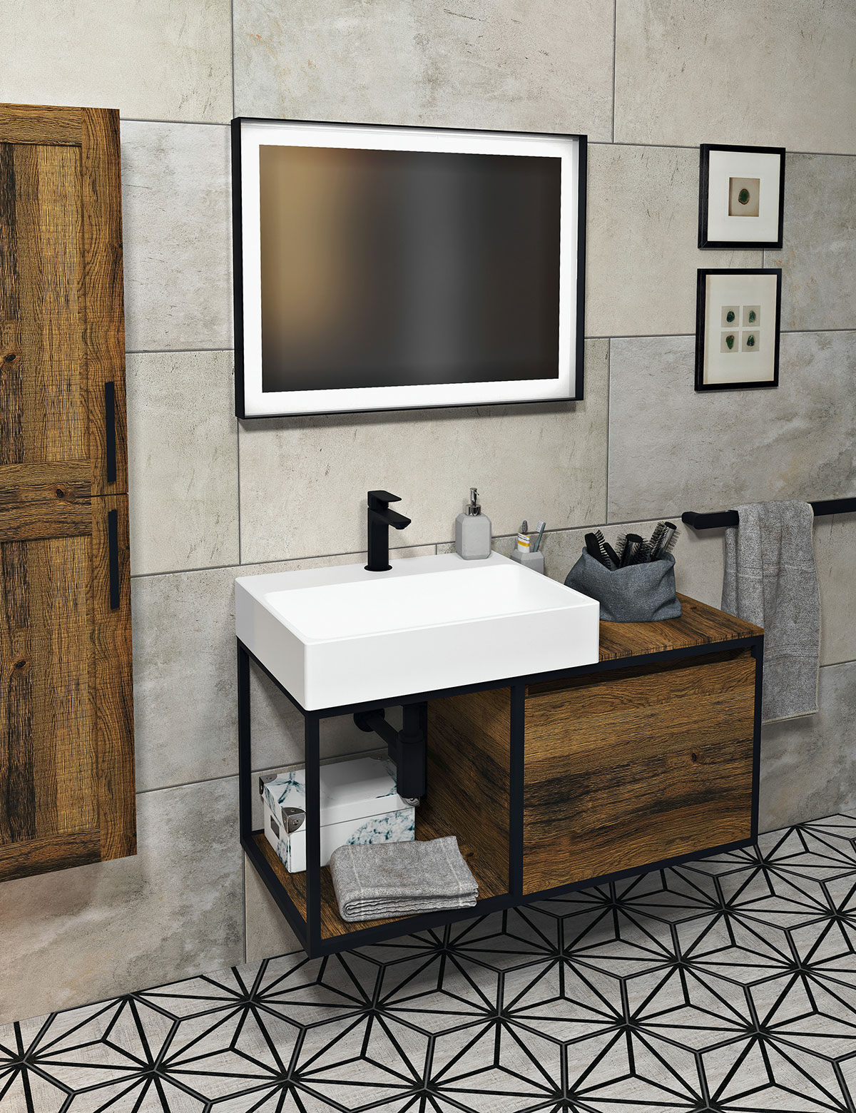 Kúpeľňu v modernom či industriálnom štýle skvele doplní potrebné štýlová umývadlová konštrukcia s integrovanou zásuvkou zo série Skara. Tá snúbi chladný aspekt matne čierneho kovu s hrejivým elementom v podobe tmavého dreva.