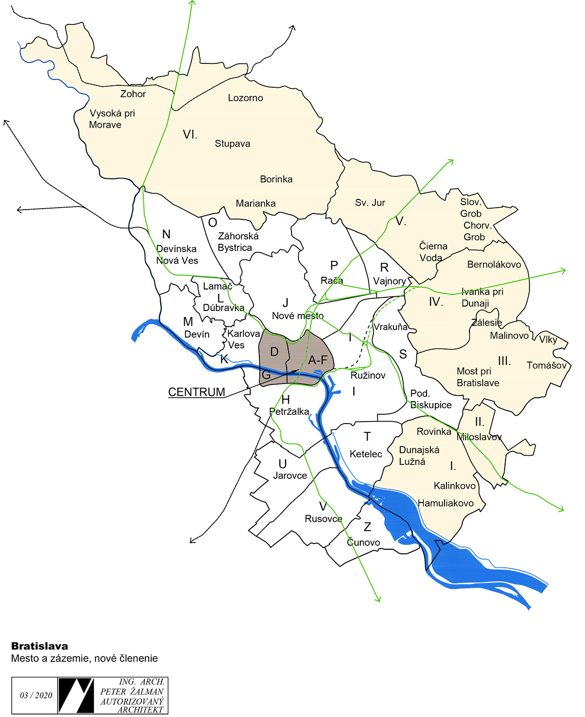 Samotné mesto autor podľa urbanistickej štruktúry člení na tri časti – centrum, vnútorné mesto a vonkajšie mesto. Prírodné fenomény, rieka Dunaj a masív Malých Karpát, predurčili hlavné osi jej rozvoja. Dnes sa počas 30 rokov suburbanizácie popri piatich základných osiach rozvinula aj šiesta, tzv. okružný rozvoj.
