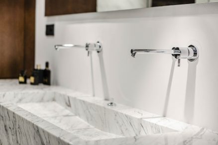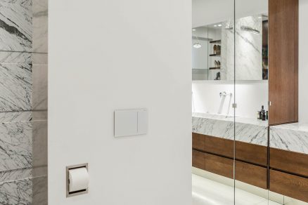 V súkromnej kúpeľni hrá prím taliansky mramor Statutario Venato. Um kamenára vystihuje kamenná doska za vaňou, ktorá bola inštalovaná ako jeden kus.