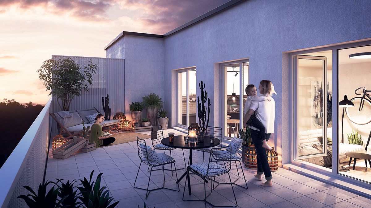 Vizualizácia interiéru a terasy v mezonetovom byte – balkón či terasa bude súčasťou každého bytu