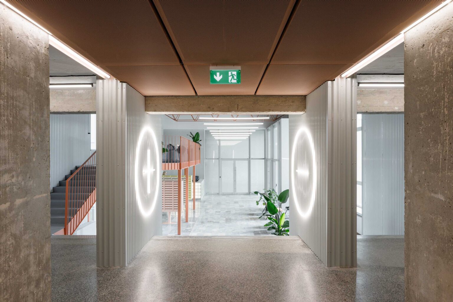 V interiéroch zohráva dôležitú úlohu farebný akcent. V kontraste s dominantným betónom a oceľou slúži ako hlavný orientačný a identifikačný prvok priestoru. „Pre návštevníka sa farba a forma stávajú orientačným prvkom a definujú jeho vnímanie priestoru,“ približuje architektka Jana Varchola Buráková.
