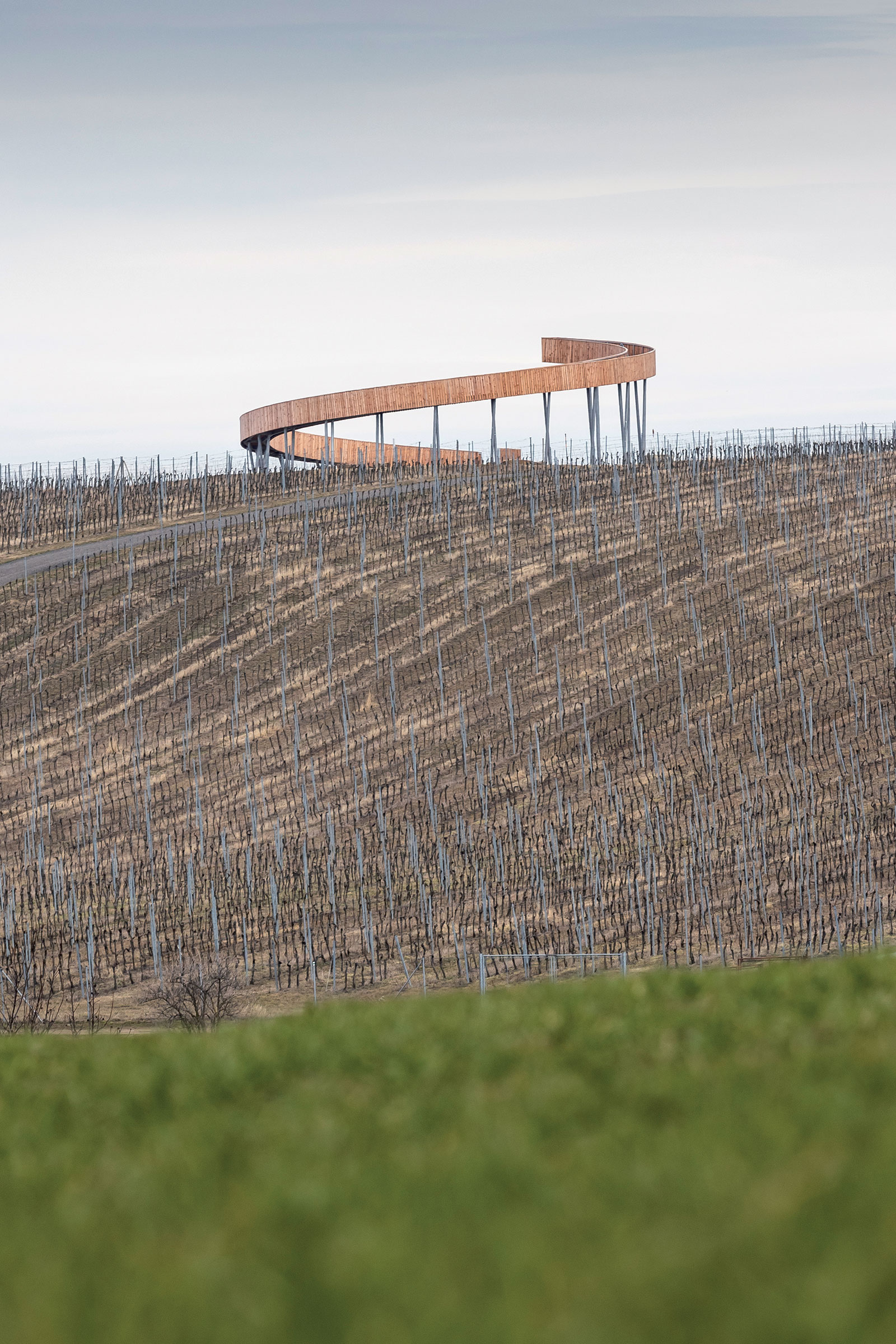 Jemná špirála netypickej rozhľadne sa dvíha nad vinohradmi nad obcou Kobylí na južnej Morave.
