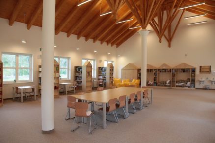 Budova zvonka i zvnútra zaujme organickými tvarmi a využitím dreva v kombinácii s jemnými svetlými odtieňmi omietky. Akcentuje sa tým potreba dostatku svetla, ako aj čistota architektonického a dizajnového riešenia. Aula, resp. vstupná hala slúži na rôzne stretnutia a podujatia.