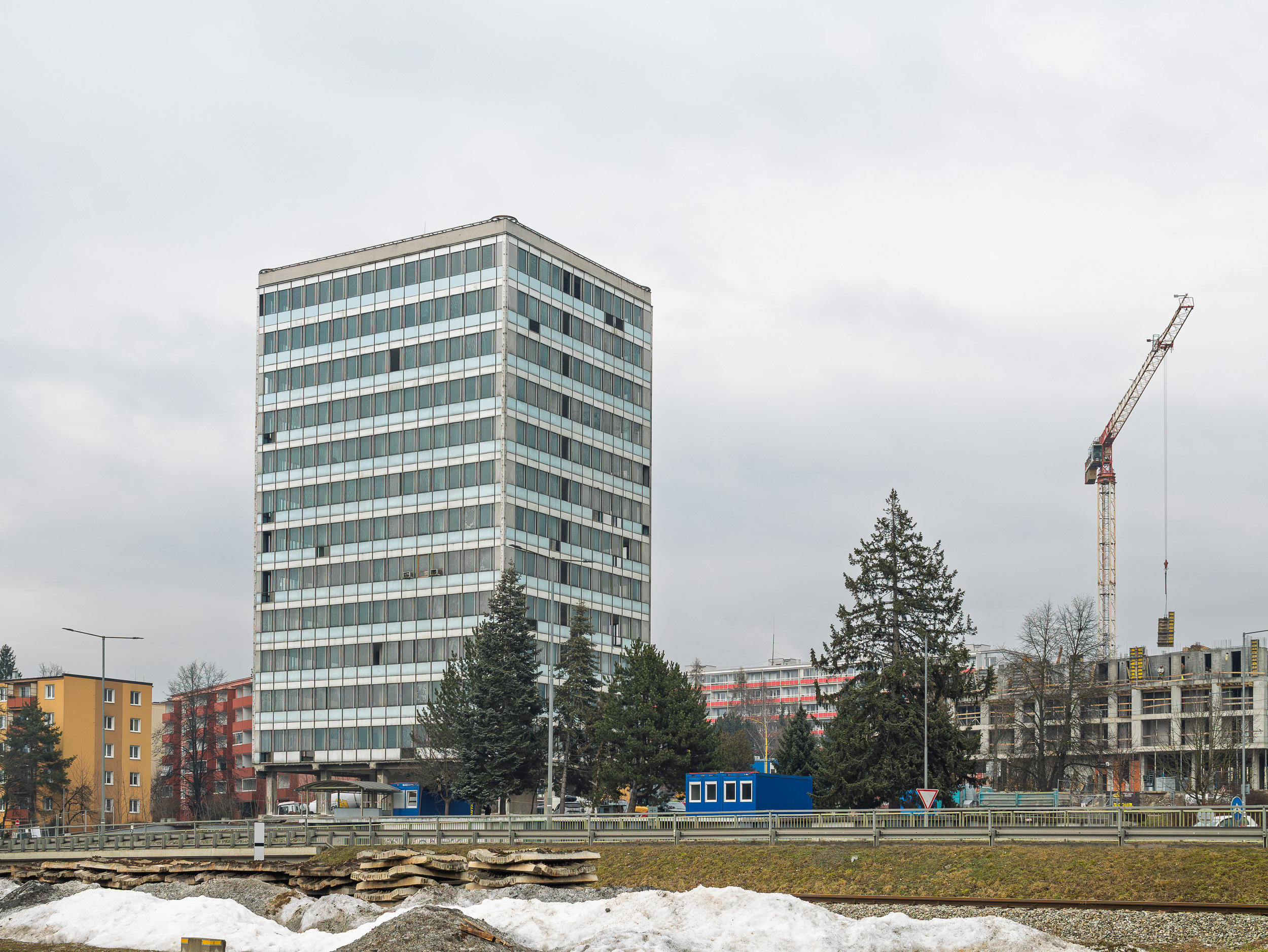 Súčasný stav budovy Váhostav, Žilina, fotené vo februári 2026