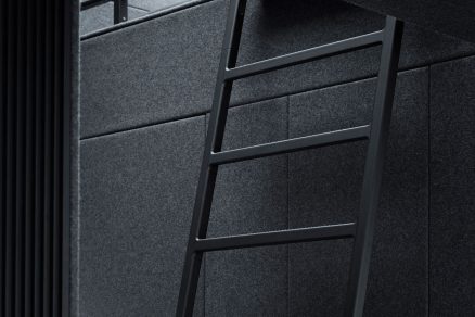 Zvláštnym zážitkom je kúpeľňa, jeden z dvoch uzavretých priestorov v objekte. Oddeľujú ju čierne steny z profilovaného plechu a strop z leštenej nehrdzavejúcej ocele. Chladný pocit, ktorý by touto kombináciou mohol vzniknúť, eliminuje elektricky vyhrievaná podlaha s magnezitovým poterom, ktorý je veľmi odolný proti mechanickému namáhaniu. Vybavenie kúpeľne je z nehrdzavejúcej ocele s práškovým povrchom kontrastnej bielej farby a tiež nesie značku VIPP. Na hornú dosku bol použitý materiál DuPont Corian, do ktorého je vsadené umývadlo.