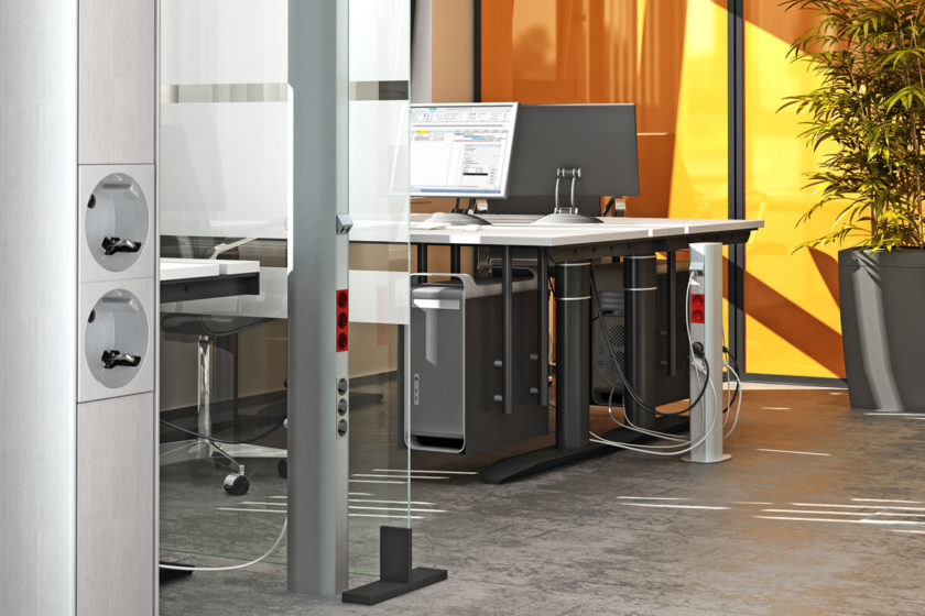 - Krátke podlahové stĺpiky s výškou do cca 1 m, napájané z podlahového systému a fixované k podlahe alebo doske pracovného stola.