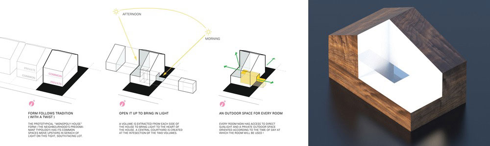 Pozmenením tradičnej vertikálnej hierarchie domu sa podarilo docieliť mnoho – najmä splniť hlavnú úlohu v oblasti presvetlenia priestoru. Súčasná potreba priameho denného svetla a zároveň zachovania intimity sa podarila naplniť na sto percent. Obytné priestory boli presunuté na poschodie, v rámci ktorého projektanti vymysleli „výkroj“ z tradičného hutného tvaru starého domu v tradičnej zástavbe.