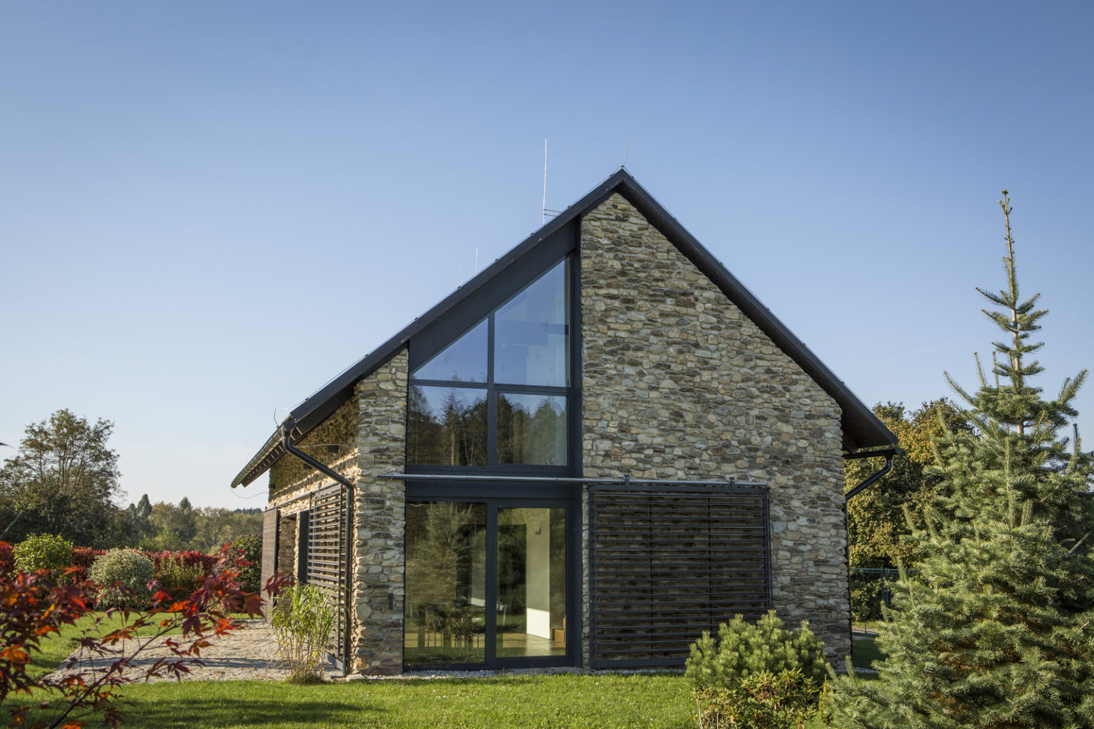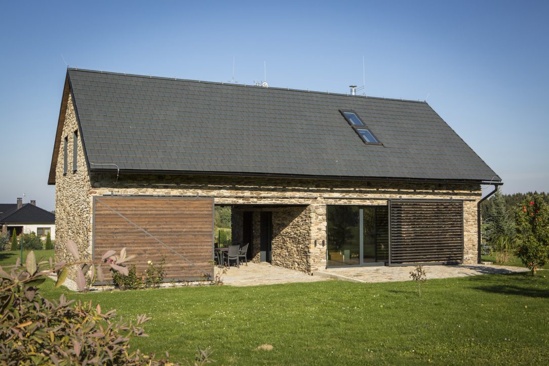 Pozemok, na ktorom nový rodinný dom vznikol, leží na kraji obce, v typickom vidieckom prostredí. Okolo sú polia, lesy, rybníky a vrchy. Stavba je umiestnená pozdĺž severovýchodnej hranice pozemku, teda súkromná záhrada na juhu pozemku nie je domom rozdelená a zostáva celá v prospech súkromia rodiny. Výrazným prvkom fasády je kameň zozbieraný z okolitých polí – tak, ako sa to robilo kedysi. Na súčasnosť upozorňujú oplechované ostenia.