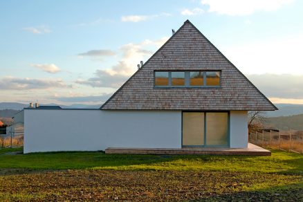 Je to prírodný materiál, ktorý bude starnúť spolu s domom tak, že každý rok bude stavba vyzerať ináč a čoraz viac splývať s prostredím. Garáž je riešená ako nenápadná prístavba domu s jednoduchou bielou fasádou.
