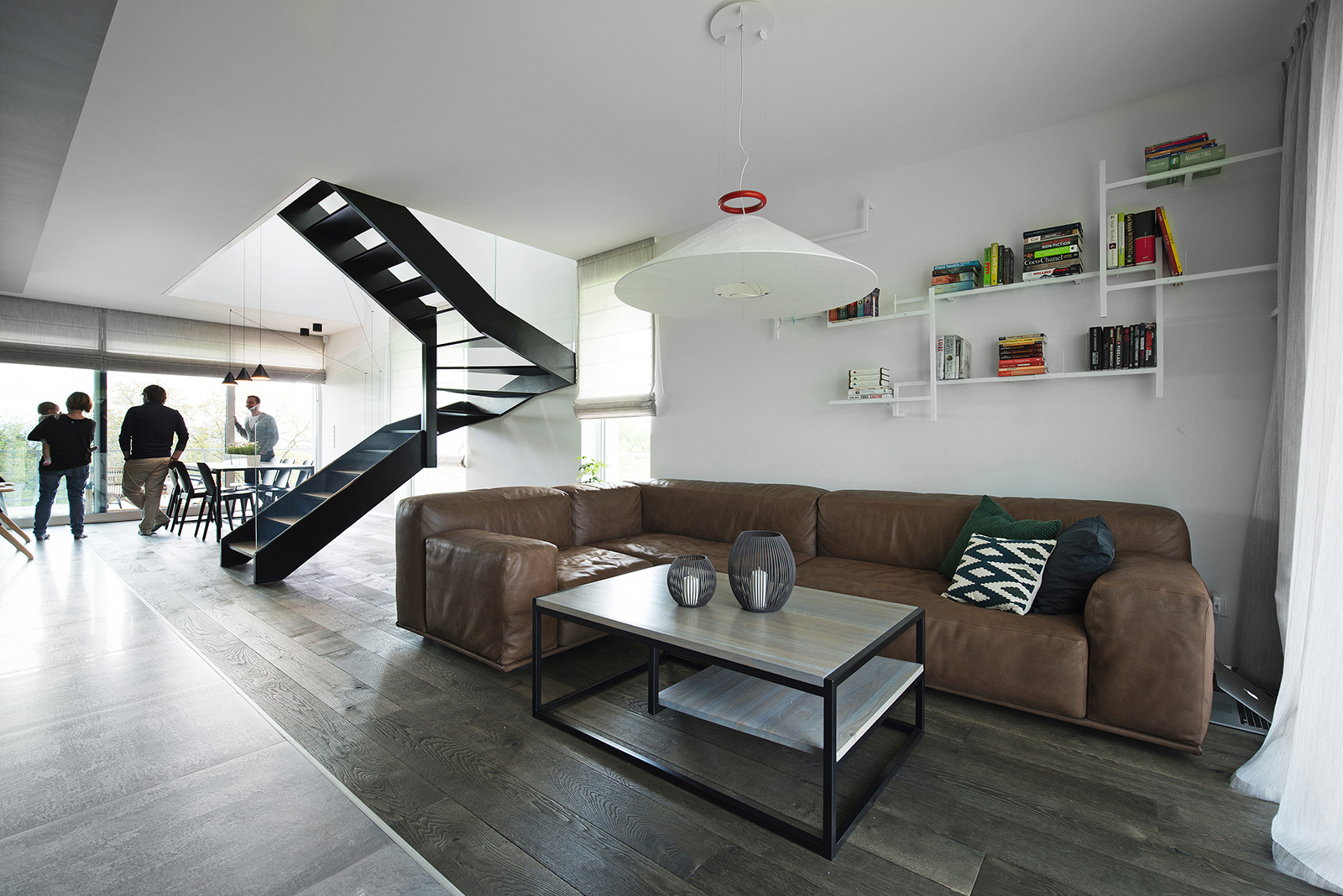Obývaciu časť od jedálenskej delí pôsobivé vzdušné schodisko so skleným zábradlím.