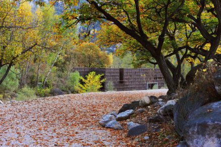 Knižnica susedí s veľkou vodnou plochou, ktorú možno prekonať po dvoch lavičkách.