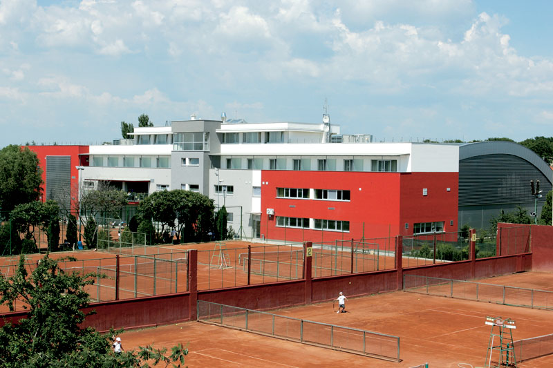 Keďže prevažnú časť uličnej fasády stavby tvorí tenisová hala, zvýšená pozornosť sa kládla na použitie materiálu, ktorý by mal aj výraznú estetickú hodnotu. Výsledkom je hliníkový strešný systém Kalzip a stenový panelový systém Kingspan. Ostatné časti stavby sú z tradičných materiálov. Jednotlivé tvary hmôt sú podporené rôznym materiálovým a farebným vyhotovením.