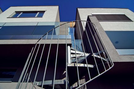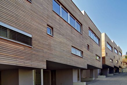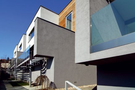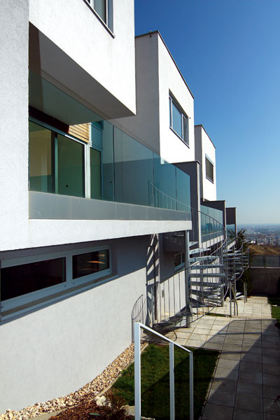 „Situovaním terasy na prvom poschodí sme podporili výhľad a zároveň zabezpečili súkromie obyvateľov domov,“ hovorí architekt. Druhé podlažie slúži ako nočná časť. Obsahuje tri izby a sociálne zariadenia. Obytný priestor ponúka veľkorysých 180 štvorcových metrov. Okrem dvoch garážových parkovacích miest má každý dom k dispozícii tri vonkajšie státia.