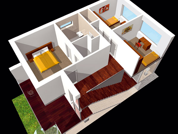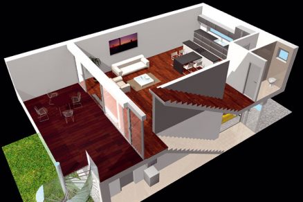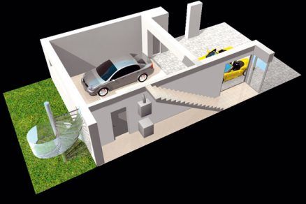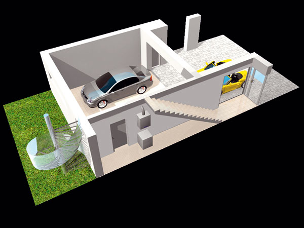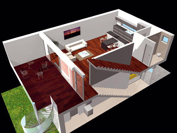 „Celú zástavbu sme kvôli výhľadu na mesto zdvihli o jedno podlažie,“ podotýka autor. Garáže nie sú v suteréne, ako by sa dalo predpokladať, ale na prízemí, ktoré voči dvom nadzemným podlažiam mierne ustupuje. Vrchná časť budovy v severnej časti pozemku zároveň zastrešuje priestor vonkajšieho parkovania. Z prízemia bytu vedú schody do otvorenej dennej časti – obývačky, spojenej s kuchyňou.