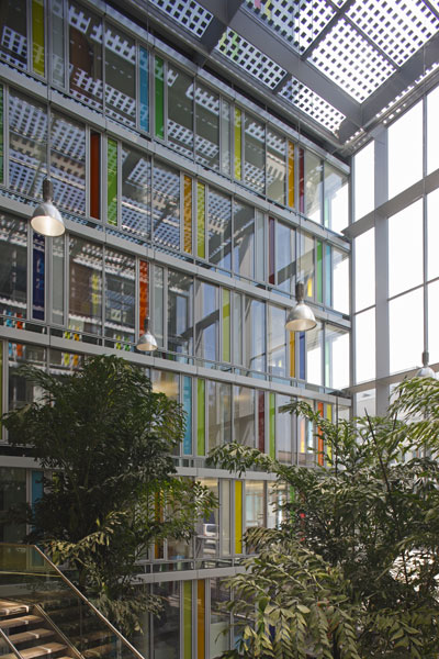 Feldmeyer: Sú pásové a perforované fasády. Pri celoplošne zasklených fasádach musíte vyvinúť veľa námahy, aby ste budovu urobili transparentnou a následne ju zatienili. Pripúšťam, že sklo je fascinujúci materiál, má dlhú životnosť a ľahkú údržbu. Kamenné alebo omietkové fasády sa oveľa rýchlejšie zašpinia, stmavnú alebo vytvárajú šmuhy. Použitie sklených fasád je však aj otázkou konceptu. Transparentnosť, ktorá umožňuje súhru medzi vonkajším a vnútorným prostredím, nám dáva jasnú výpoveď. Ak vnútorné priestory neobsahujú steny, potom je budova celkom priehľadná. V dôsledku toho rozhodnutie pre celoplošne zasklenú fasádu naznačuje aj koncept jej využitia.