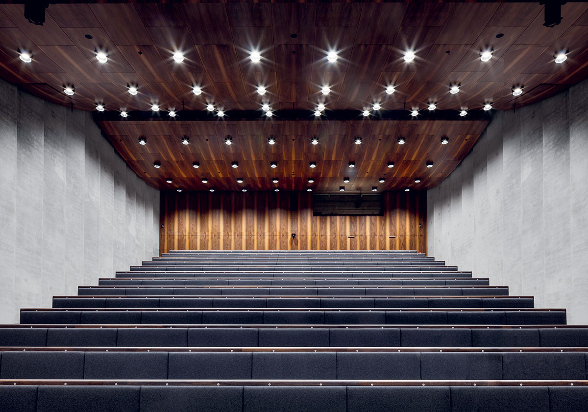 V interiéri sa strieda pohľadový betón a ušľachtilé drevo. Prednášková sála je z akustických dôvodov obložená orechom.