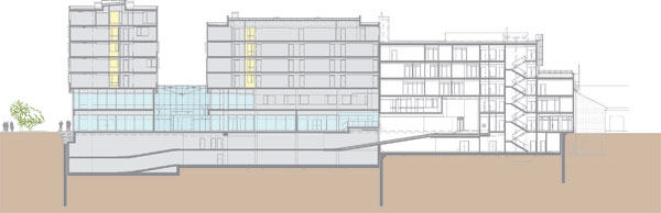K hotelu sa pripája aj menší administratívny objekt s architektonickým odlíšením jeho funkčnej náplne. „Nechceli sme, aby na mieste vznikla hradba súvislej steny, ale snažili sme sa prostredníctvom variabilného stvárnenia fasád docieliť, aby objekt výrazovo prispel k premenlivosti celej ulice,“ hovorí architektka Monika Štekláčová.