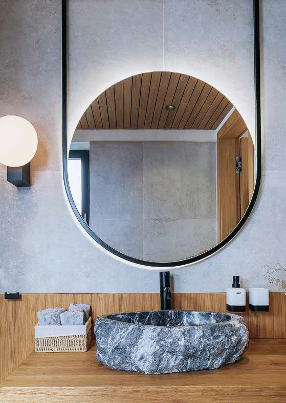 V kúpeľni dominuje ručne vytesané umývadlo z mramoru Grigio Carnico.