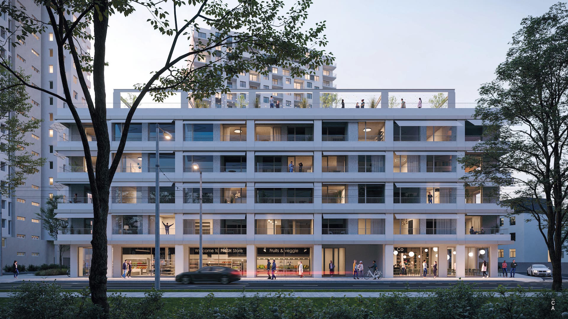 Projekt Kvarter - finálna architektonická podoba domu. V pozadí vidieť výškovú budovu developmentu Jégeho Alej