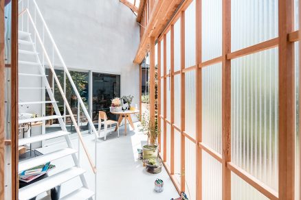 Netradičná stavba stojí v novej obytnej štvrti v horách, kde je vlhké a mierne chladné podnebie. Pri pohľade na ostatné domy v tejto časti si všimnete verandy uzatvorené vlnitým polykarbonátom. Tieto ohradené terasy domáci používajú v zime ako sklad alebo ako miesto na sušenie bielizne – je to praktická črta, ktorá by nemala chýbať.
