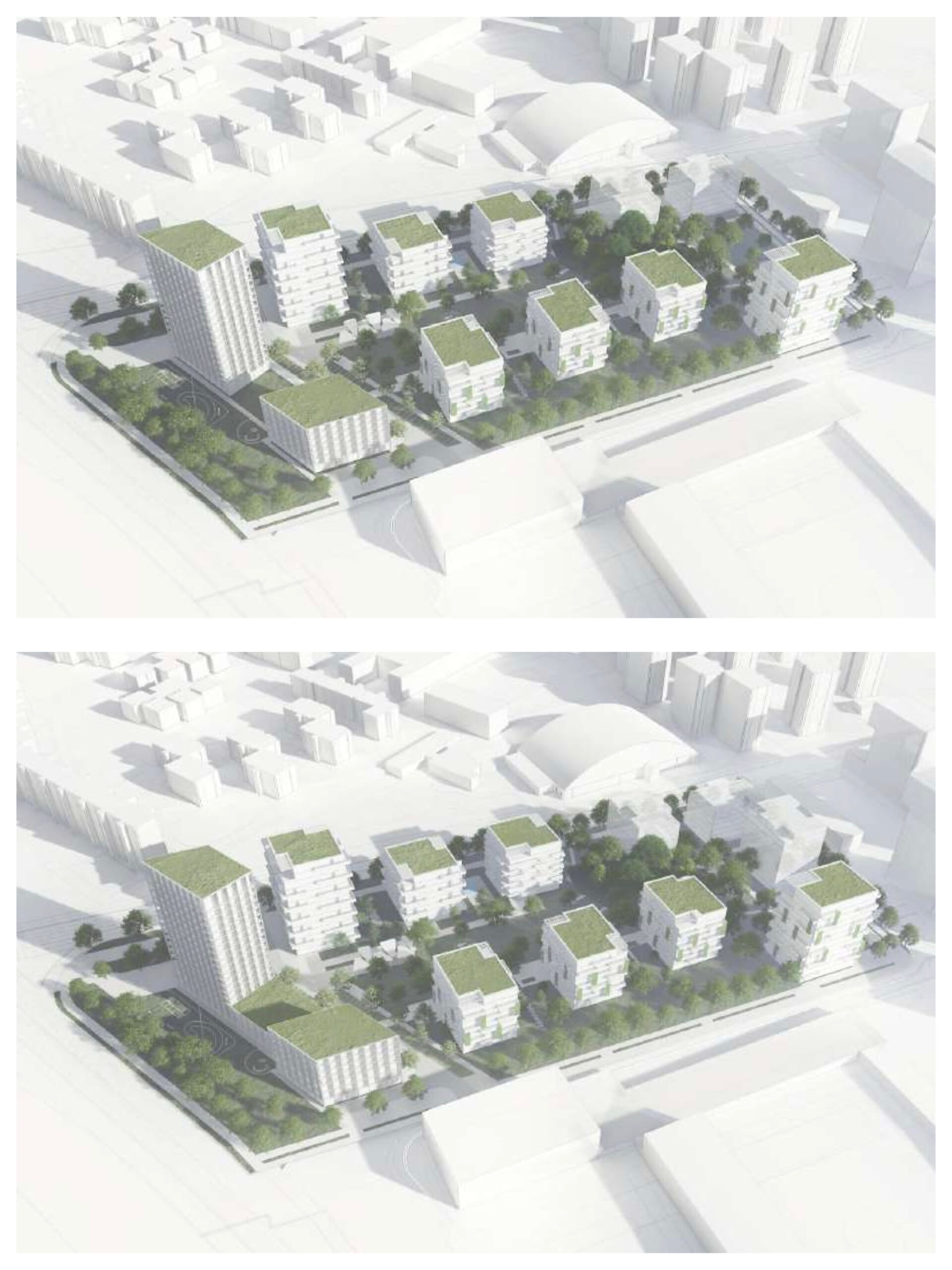 Urbanistická štúdia predstavila dva varianty voľne stojacich bodových domov. Prvý variant by tvoril sériu 11 domov, kde by vzniklo 643 bytov pre 1 535 obyvateľov a parkovanie by zabezpečovalo 1 049 miest. Druhý variant počítal so 788 bytmi určených pre 1 939 rezidentov a 12 objektov. Statická doprava by sa navýšila na 1 208 stojísk. Súčasťou oboch možností je vnútroblok s výrazným zeleným charakterom. Štúdia napokon určila ako vhodnejší variant 2.