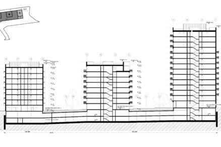 Návštevníkom krátkodobého ubytovacieho zariadenia bude k dispozícii spoločná terasa na ustúpenom ôsmom podlaží a orientovaná bude do zeleného vnútrobloku. Do vnútrobloku sú orientované aj priestranné striedavo usporiadané balkóny trojizbových apartmánov na južnej fasáde, vysúvajúce hmotu objektu C ešte hlbšie do existujúcej zelene. Celkový počet izieb dokumentácia rovnako neuvádza.