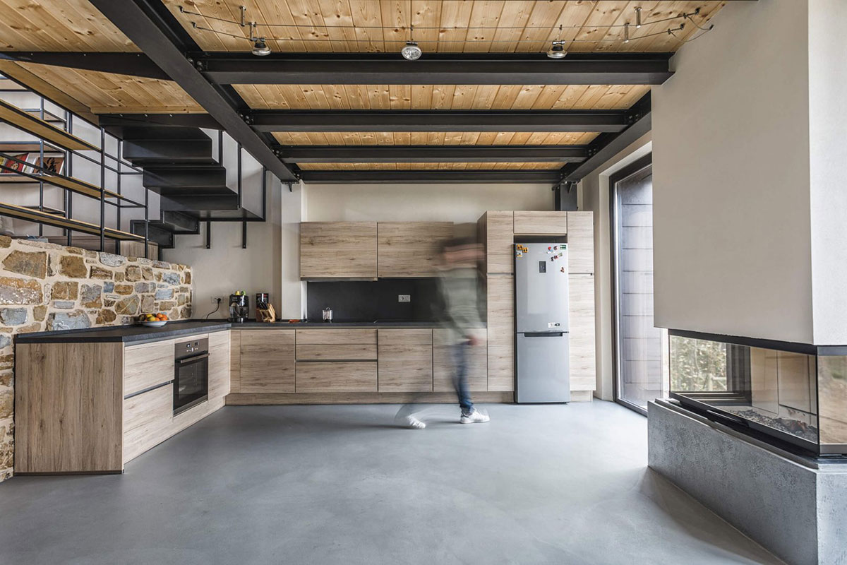 Kameň a drevo ako základné materiály domu sa objavujú aj v kuchyni