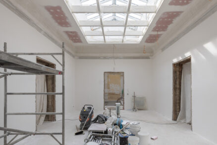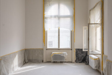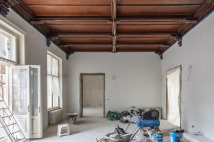 Lešenie je zložené aj z časti fasády vo dvore, tu však rekonštrukčné práce ešte stále prebiehajú. Interiér očarí najmä vysokými stropmi, ako aj zachovanými ozdobnými a umeleckými prvkami, ktoré sú už dnes obnovené.