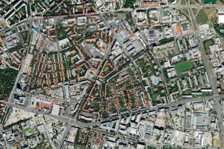Ortofotomapa Bratislavy s vyznačením domov Kolónia malých bytov na Miletičovej a Trenčianskej ulici