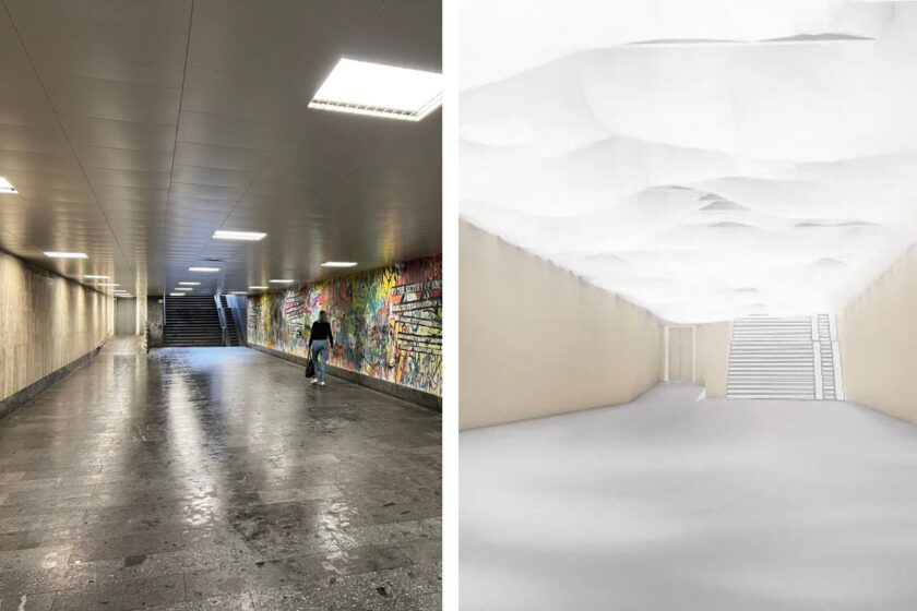 „Mechanizmus umožňuje pohyb materiálu v reálnom čase – napínanie a zvrásňovanie mení atmosféru prechodu,” dodávajú. Vo výsledku bude zavesená 3D textilná membrána slúžiť ako umelecká intervencia aj ako riešenie pre osvetlenie.