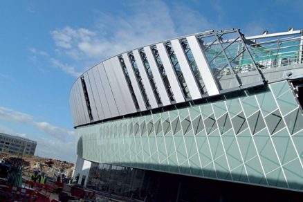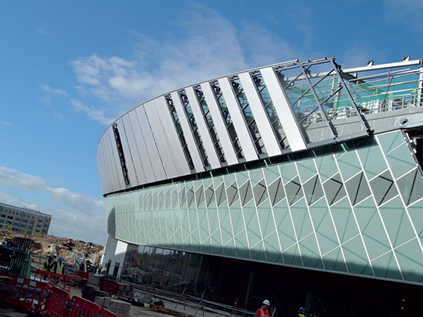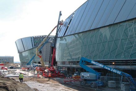 Záverečnú fázu osadenia dvojskiel poľa potom vykonal robot riadený pracovníkom stojacim na teleskopickej plošine s pomocou diaľkového ovládania. Na robotovi boli primontované prísavky, ktoré manipulovali so sklami ťažkými až 400 kg. Presnosť zariadení bola úplne fascinujúca, pretože osadenie takých ťažkých dvojskiel zvládali s milimetrovou presnosťou aj vo veľkých výškach a pri zachovaní tých najprísnejších pravidiel bezpečnosti práce. Najvyšší pás opláštenia tvoria sendvičové fasádne panely s hrúbkou 60 mm, ktoré dosahujú lokálne dĺžku až 14,5 m. Sú navyše osadené šikmo a vyklonené do negatívnej roviny pod veľkým uhlom. Už vyrovnané oceľové podkonštrukcie boli tvrdým orieškom, pretože jednotlivé osadzovacie body sa zameriavali a montovali v trojrozmernom module. Na montáž panelov bol spracovaný špeciálny technologický postup. Výška, do ktorej sa osadzovali panely, dosiahla v niektorých miestach až 25 m.