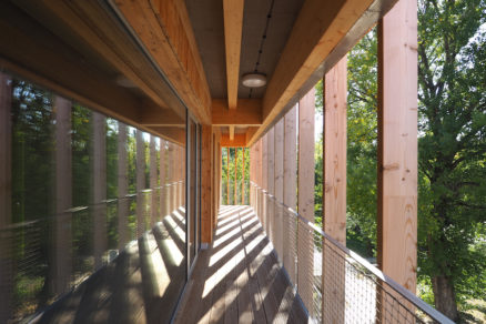 Priestory prízemia expandujú na exteriérovú pobytovú a komunikačnú terasu, z ktorej vedie otvorené schodisko na poschodie. Tu sú situované šatne, sklady, sušiarne a fitness.