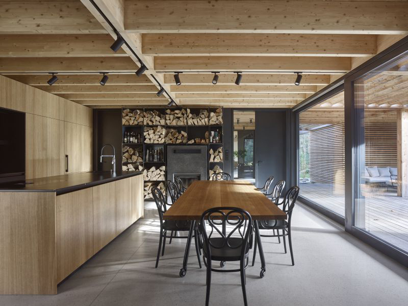 Na ľavej strane kuchyne sa nachádza presklená fixná stena a ďalší z mnohých možných vstupov do interiéru. Na jedáleň následne nadväzuje hlavný obytný priestor, v ktorom liata cementová podlaha prechádza do olejovaných drevených masívnych dubových lamiel s priznanou fazetou od firmy Podlahy Šesták. Prechod medzi oboma typmi podláh je pritom, v duchu celého konceptu stavby, pohľadovo priznaný.