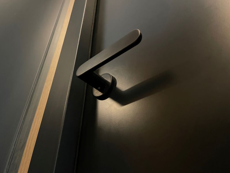 Kľučky NOVA sú v tejto realizácii doplnené okrúhlymi rozetami s oddelenými spodnými rozetami so zámkami. „Pokiaľ je to možné, tento typ kovania v projektoch radi používame. Je to detail, ktorý je nielen veľmi elegantný, ale aj rovnako funkčný ako klasická rozeta vcelku, ktorú vídame všade naokolo. Je pre nás dôležité, aby kovanie pôsobilo spolu s dverným krídlom v harmonickej synergií ako jednotný celok,“ dodávajú architekti.