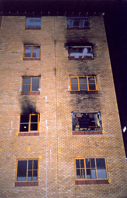 | Obr. 9 Pohľad na fasádu budovy po požiarnej skúške | Obr. 10 Interiér budovy po šesťdesiatminútovom požiari |