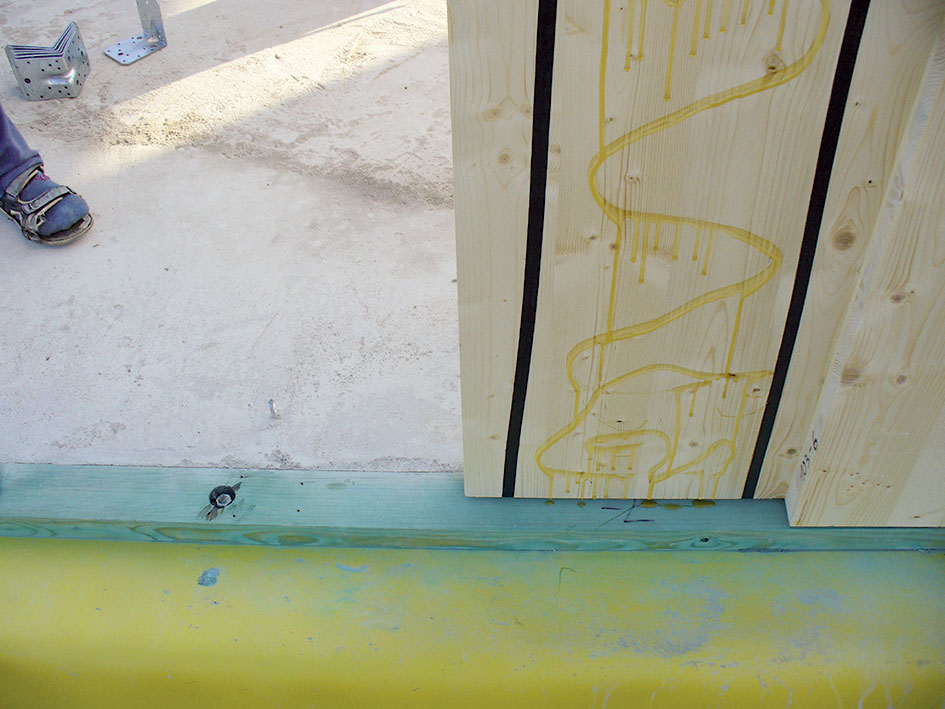 » Veľkoplošný viacvrstvový panel typu CLT (cross laminated timber – krížom lepené drevo); každá vrstva panelu tvorená lamelami smrekového dreva s orientáciou vláken jednotlivých vrstiev kolmo na susedné vrstvy; lamely zlepené v každej vrstve v pozdĺžnom aj priečnom smere