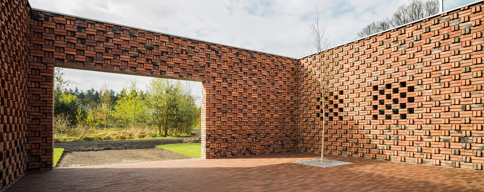 Uzatvorený dvor na juhovýchode stavby obklopený tehlovými múrmi tvorí vstupnú časť do domu