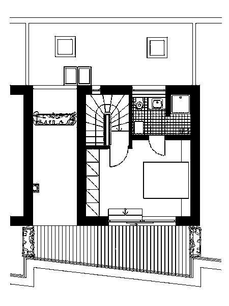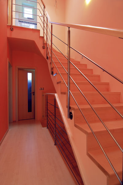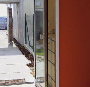 „Snažili sme sa dom navrhnúť ako viacgeneračný, prízemie je miestom stretnutia celej rodiny a tvorí ho obývačka so zázemím a, samozrejme, kuchyňa. Na druhom poschodí sú dve izby s kúpeľňou a pracovňa a na najvyššie podlažie sme umiestnili spálňu so zázemím a teraskou,“ hovoria architekti z ateliéru Vallo & Sadovsky architects. Táto vertikálna segregácia generačných zón môže fungovať aj v opačnom poradí. Horné poschodie má malú terasu s výhľadom na mesto. Dvojgaráž situovali do prednej časti parcely. „Garáž v tejto polohe funguje ako prvok, ktorý vytvára intímnu zónu,“ objasňuje architekt Matúš Vallo. Tento prvok navyše eliminuje nevyhnutnosť oplotenia v uličnom priestore. Vstupná bránka do súkromného priestoru zároveň prepája kubusy garáží. Intímny priestor, ktorý tu vznikol, dovolil štedro zaskliť obývací priestor a dištancovať ho od ruchu ulice. Pôvodná idea počítala s hustým zeleným plotom na mieste vnútornej hranice parcely.