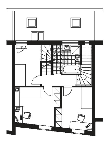 Odstúpením garáže z verejného priestoru smerom dovnútra parcely vznikla plocha na parkovanie dvoch vozidiel, vďaka čomu sa pred domami ponechá voľný priestor ulice.