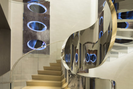 Luxusné povrchy a materiály je možné nájsť v každom módnom butiku, v tomto prípade však autor stavil na bielu a béžovú farbu v kombinácii s drevom a zrkadlovými plochami, do ktorých zabalil aj zakrivené schodisko.