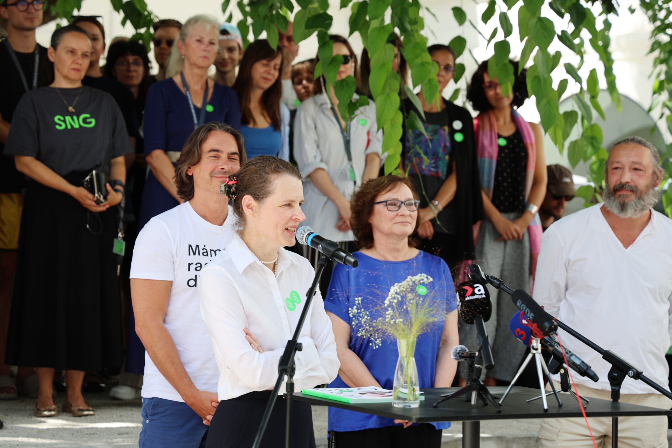 Tlačová konferencia na nádvorí SNG v stredu 7. augusta po odvolaní generálnej riaditeľky Alexandy Kusej. Tlačovej konferencie sa zúčastnil aj odvolaný riaditeľ SND, Matej Drlička