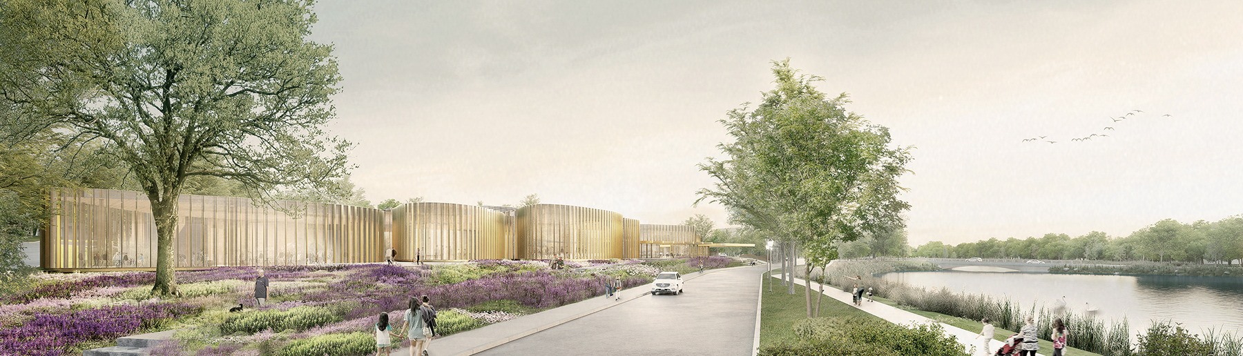 Tak ako pôvodná budova, aj nové divadlo bude stáť uprostred parku na brehu spomínanej rieky Avon, ktorá tu vytvára príjemné jazero Victoria. Jednou z priorít architekta bolo zachovať spojenie s prírodou a reflektovať zvlnený charakter brehu v návrhu. Okolo centrálneho javiska tak vzniklo rozvoľnené foyer plné dodatočných priestorov na menšie podujatia a recitály. (Keďže počas zvyšku roka stratfordský festival aj pôvodnú budovu prenajíma klubom a záujmovým krúžkom seniorov, multifunkčnosť je prirodzene namieste.) K priestorom pribudne aj fórum, „laboratórium“ a kaviareň.